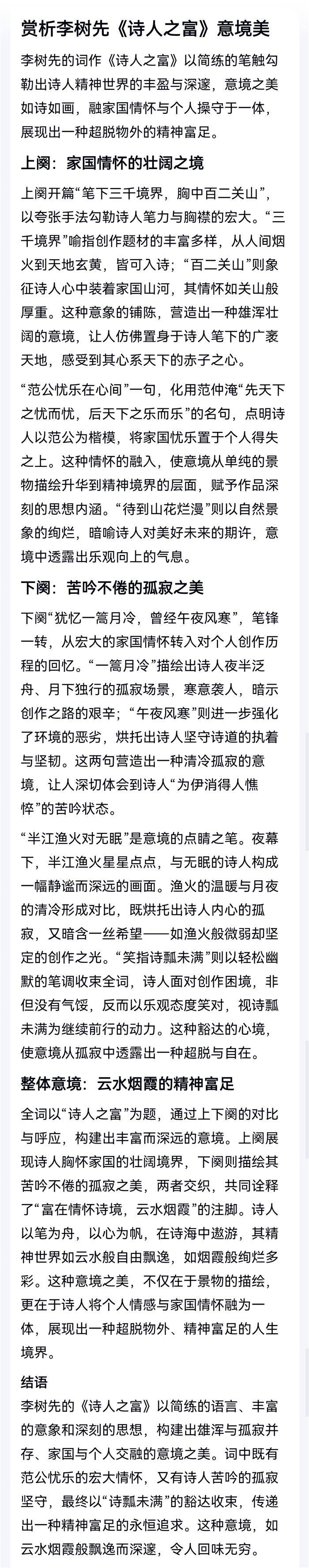注:诗人之富,富在情怀诗境,云水烟霞也。上阙,诗人心境,家国情怀。下阙,月冷风寒,苦吟不倦。